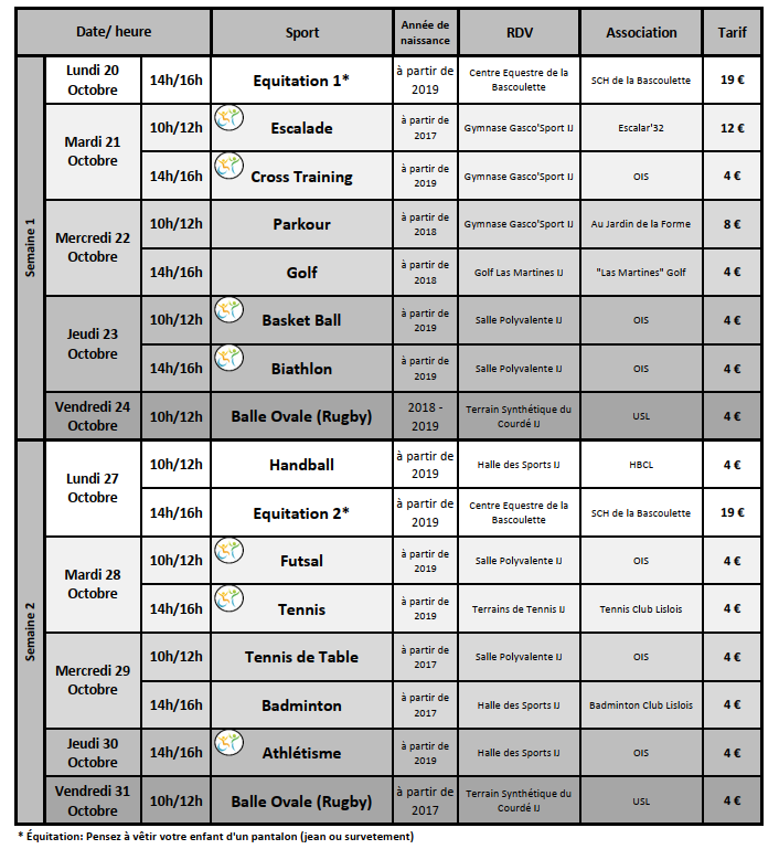 Merci de vérifier l’ensemble des informations avant l’inscription (âge minimum/maximum, matériel nécessaire, date et lieu de l’activité). En cas de doute n’hésitez pas à nous appeler. Toute demande d’annulation des activités devra être justifiée.